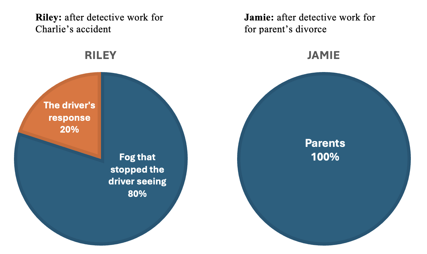 For example, Jamie thought ‘It is my fault my parents divorced’. Riley thought ‘I should have warned Charlie to stop the bike accident’.